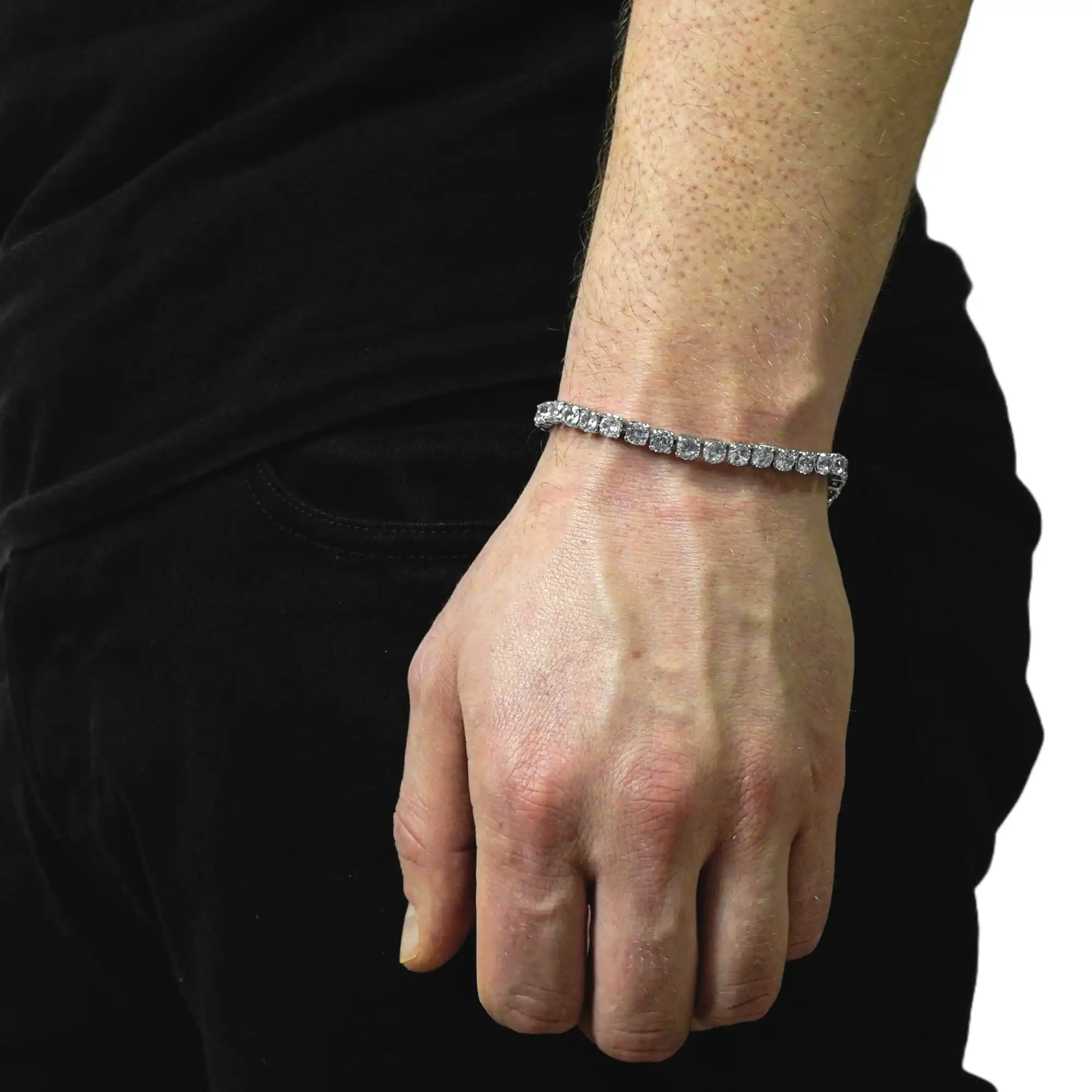 Whether you want to make a statement with your attire or turn heads at an event, let our 5mm Silver Cubic Zirconia Tennis Bracelet for men elevate your style to a new level. Packaged in our luxurious silver-embossed gift box, it becomes an unforgettable gift for any man who enjoys the finer things in life. We have a 3mm silver bracelet as well, have a look if you are looking for a thinner version.