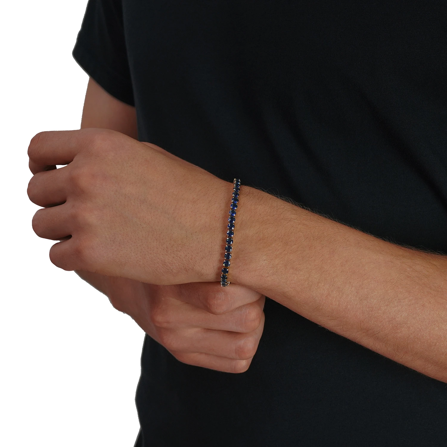 Our gold blue tennis bracelet for men is built around one idea: controlled brilliance. A row of deep blue stones—dark, lucid, and glassy – travels the full length of the bracelet, each setting creating a clean rhythm of colour and light.