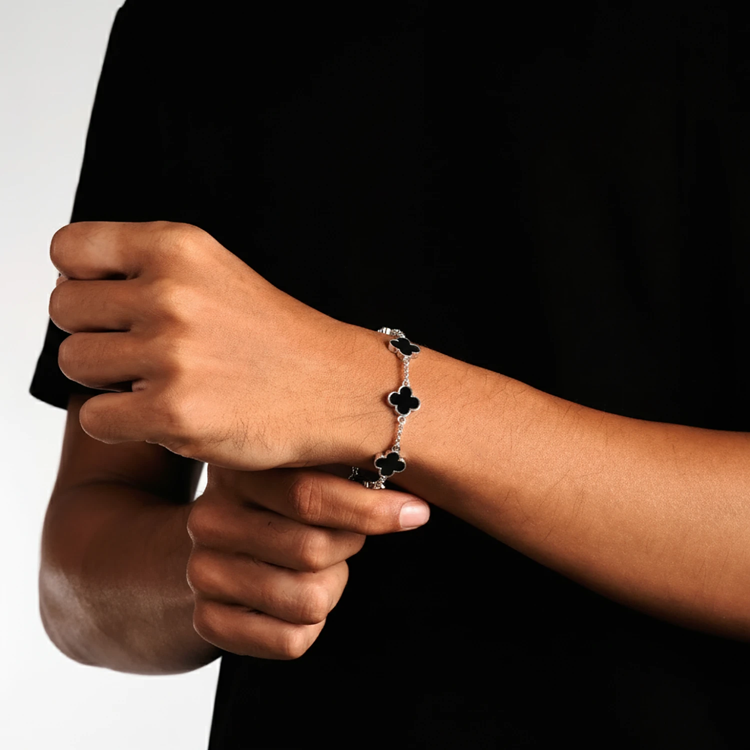 A refined study in contrast, the onyx clover bracelet for men: mirror-polished 316L stainless steel frames smooth black onyx clover stations for a crisp, architectural silhouette. Hypoallergenic, water and sweat resistant, and finished with an adjustable lobster clasp for a tailored fit. Our Silver Onyx Clover Bracelet delivers quiet luxury—precision, durability, and a striking monochrome finish that elevates workwear and evening looks alike.