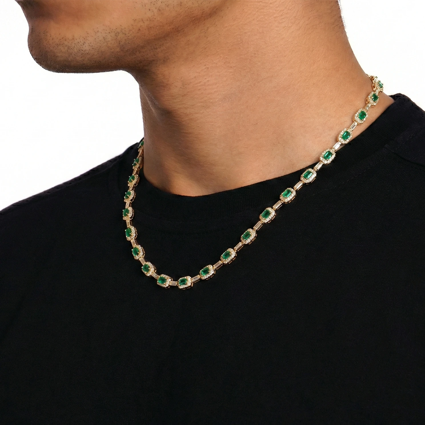 The Gold Emerald Chain is built around contrast: vivid green against warm gold, clean geometry against soft radiance. Each emerald-cut stone is given its own presence, framed in a luminous gold setting that feels almost like a miniature bezel of light. Between them, slim connecting links create breathing space, allowing every section to register individually rather than blur into a single line. The effect is elegant, deliberate, and strikingly composed.