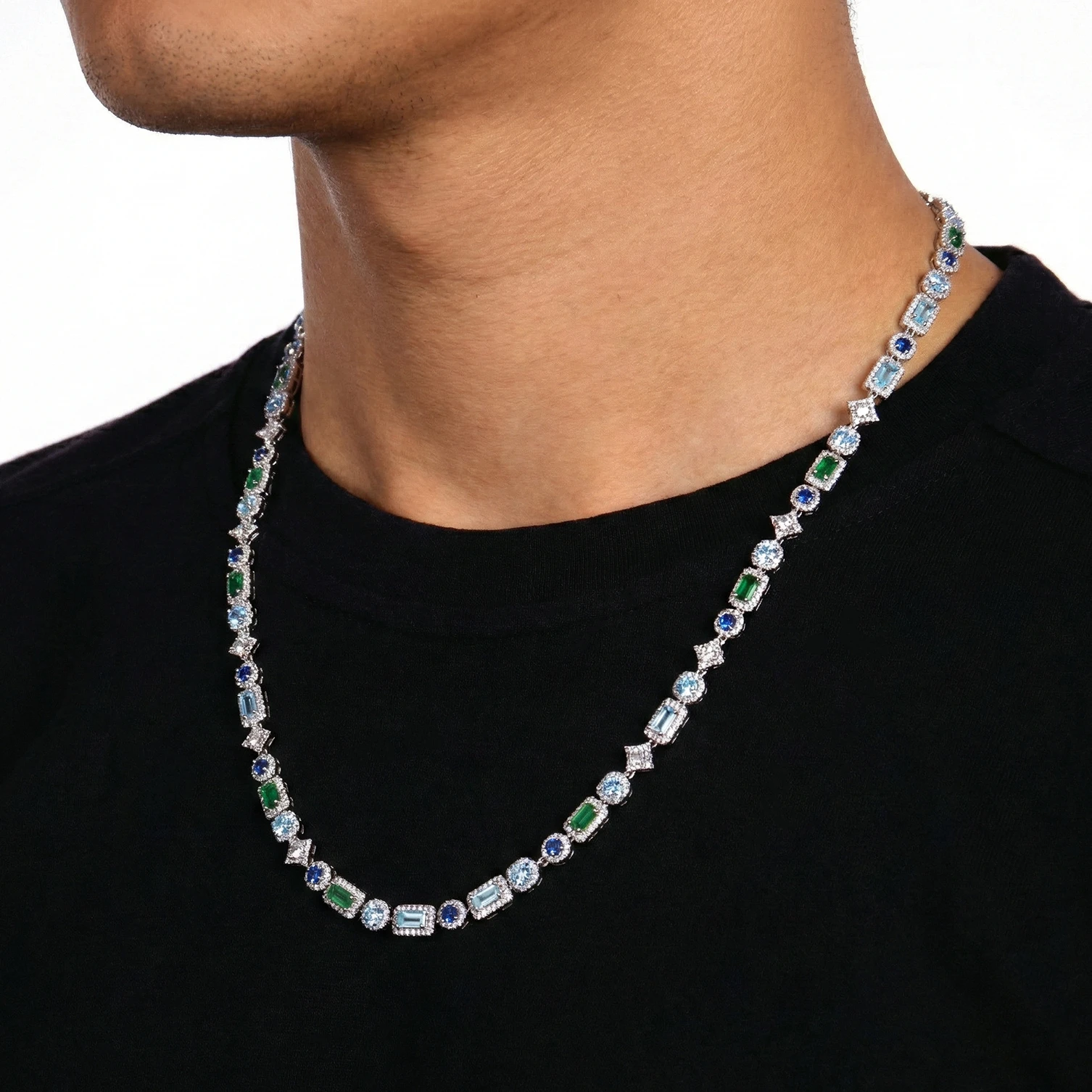 The Mixed Gemstone Chain Necklace is designed with contrast in mind. Brilliant blue, green, clear and pale aqua stones are arranged in a considered sequence, creating a rhythm of colour, light and structure across the length of the chain. The result feels precise rather than excessive—an elegant men’s gemstone necklace with a sharper, more architectural character.
