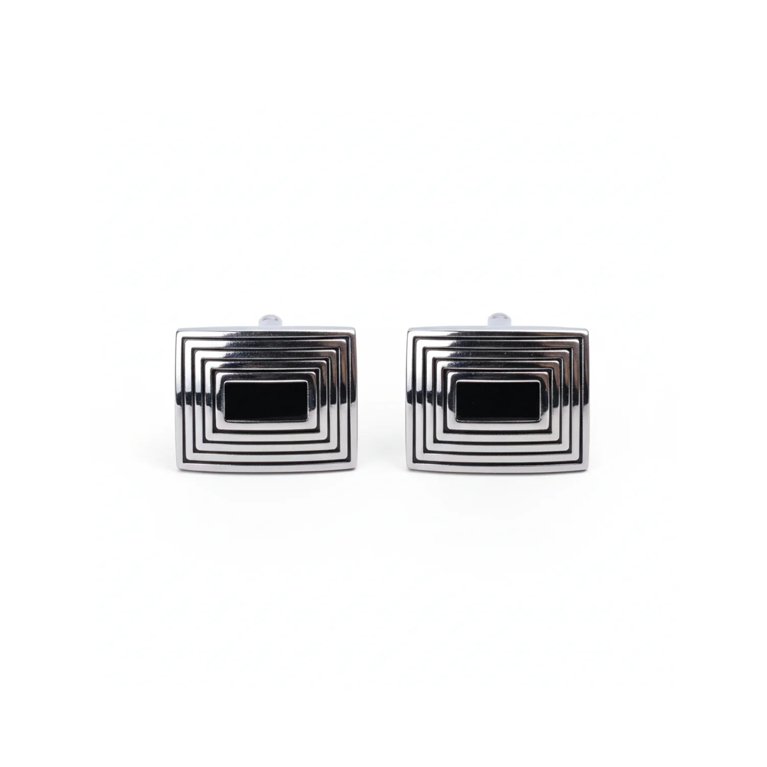 Architectural and assured, the Silver Onyx Portal Cufflinks set a polished rectangular bezel around a jet-black onyx inlay, framed by stepped concentric ridges for depth. The sleek profile and secure whale-back clasp keep cuffs clean and sharp. Refined men’s silver cufflinks that elevate suits, wedding tailoring and black-tie—contemporary, confident and unmistakably original.
