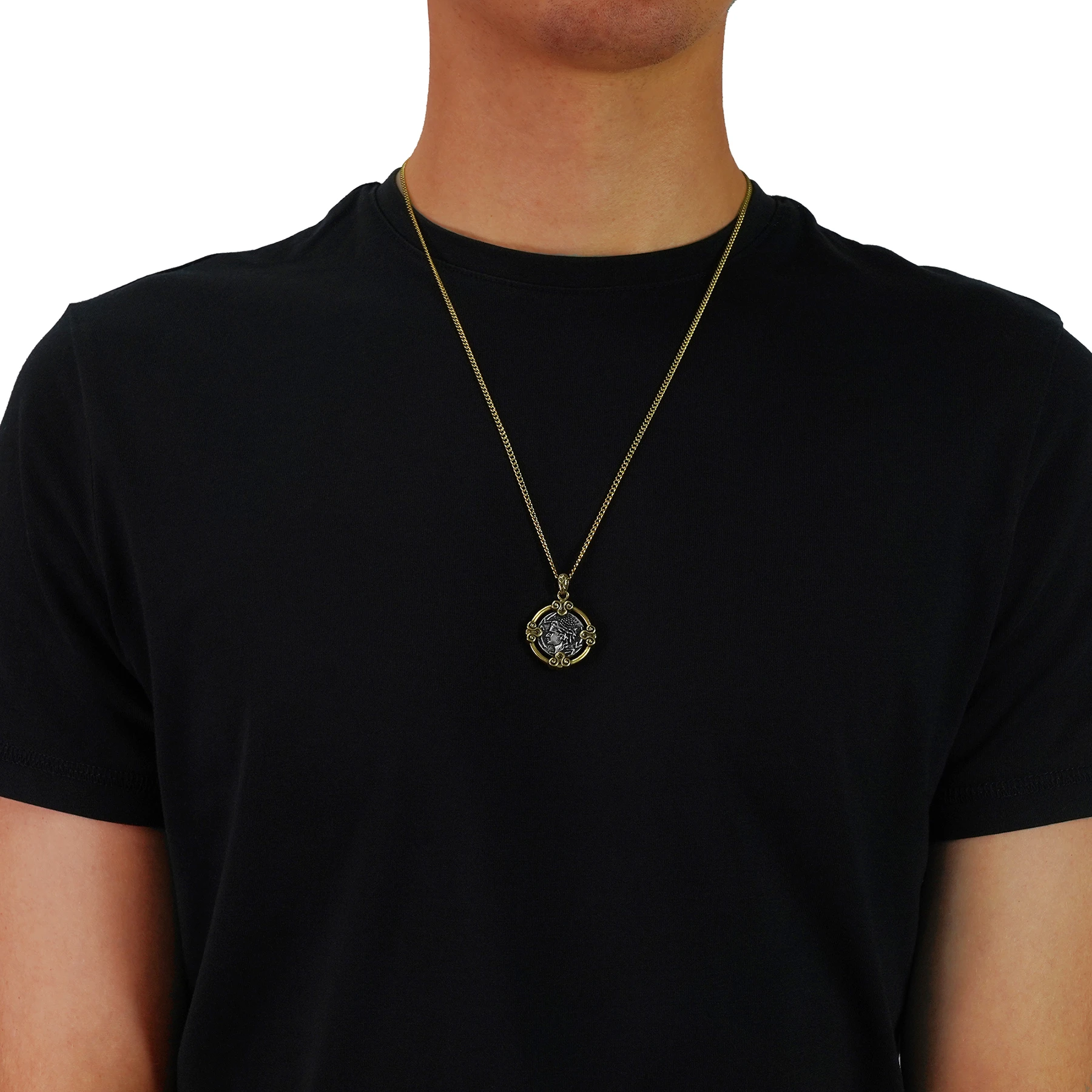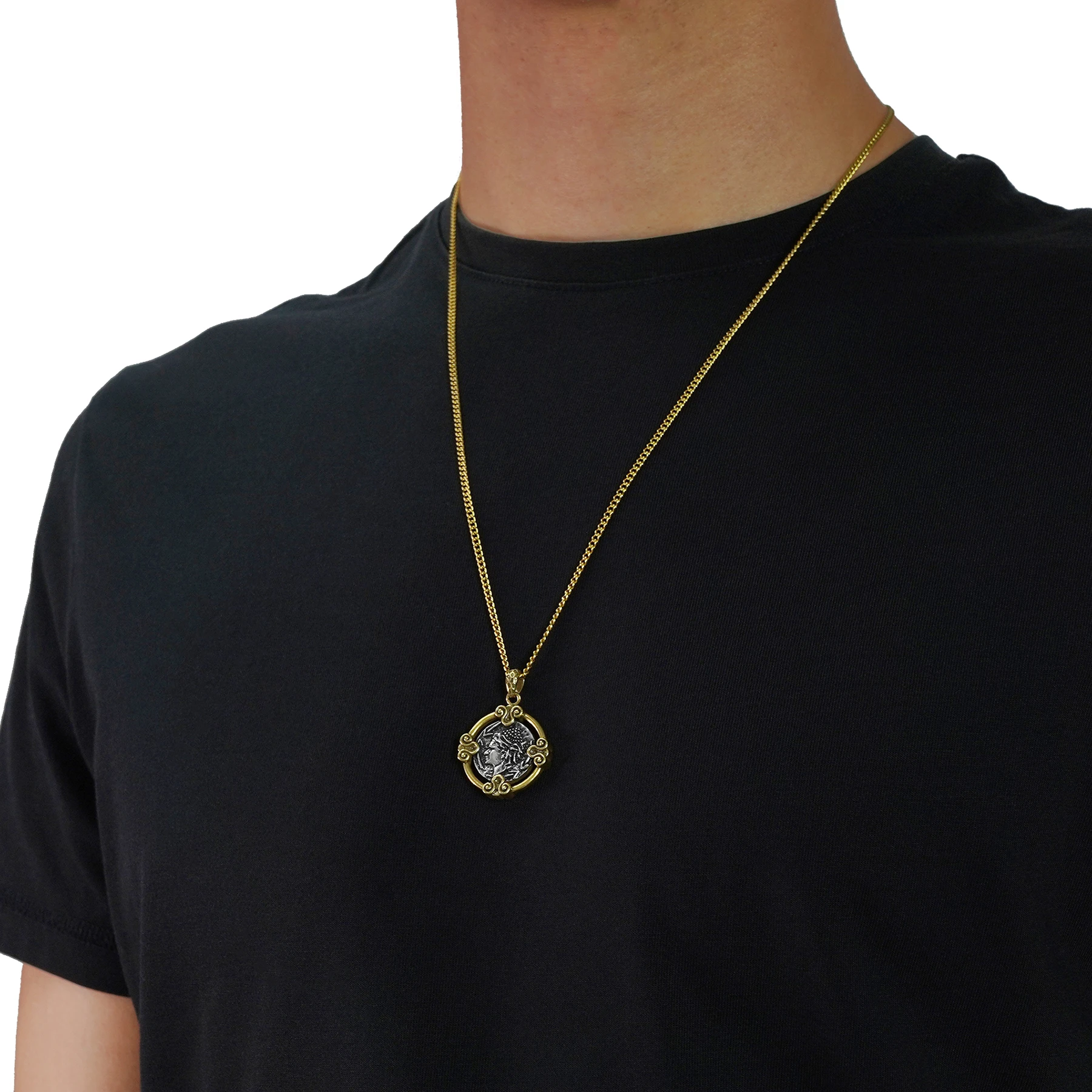 An Alexander the Great pendant necklace that wears like a relic—bold, composed, and unmistakably historic. This men’s coin necklace features a crisp, antique-style profile on one side and a warlike reverse emblem on the other, framed by sculpted scrollwork that feels almost architectural. Designed for those drawn to ancient Greek symbolism, it’s a statement pendant for men that carries presence without shouting.