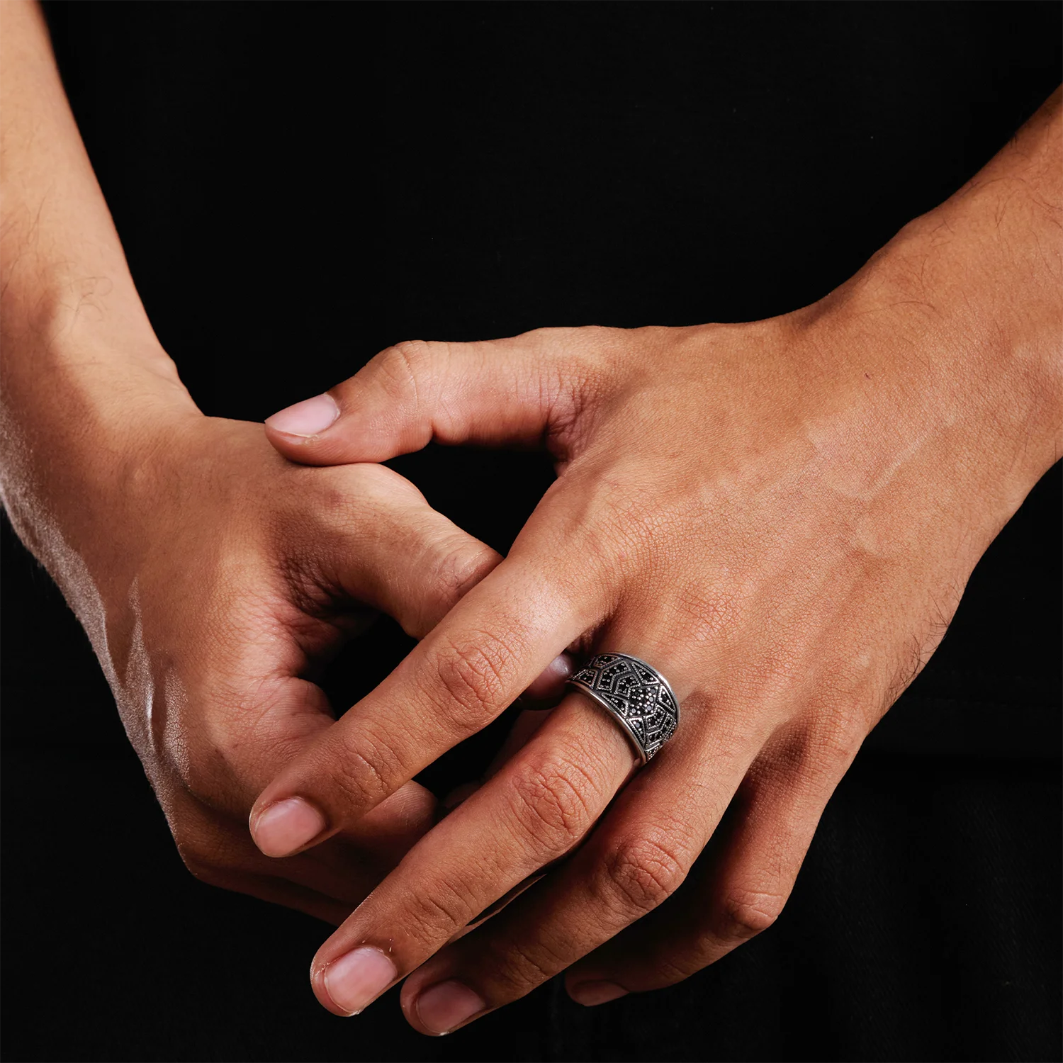 Sculpted in solid 925 sterling silver, the Astral Mosaic Ring frames a geometric star pattern in oxidised relief, punctuated by fine bead-set texture. The contrast between darkened recesses and bright, hand-polished lines gives this men’s sterling silver ring a confident, architectural presence that stands out without shouting.
