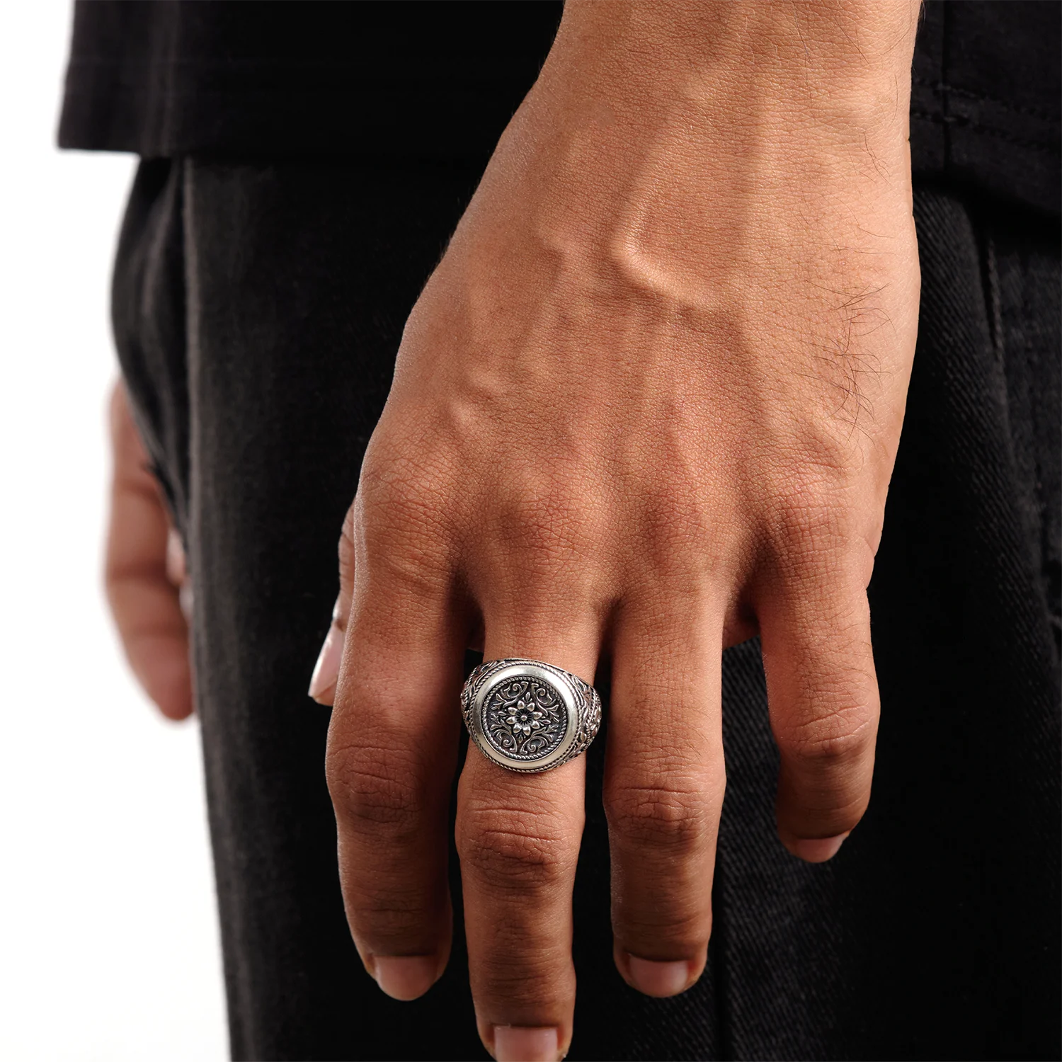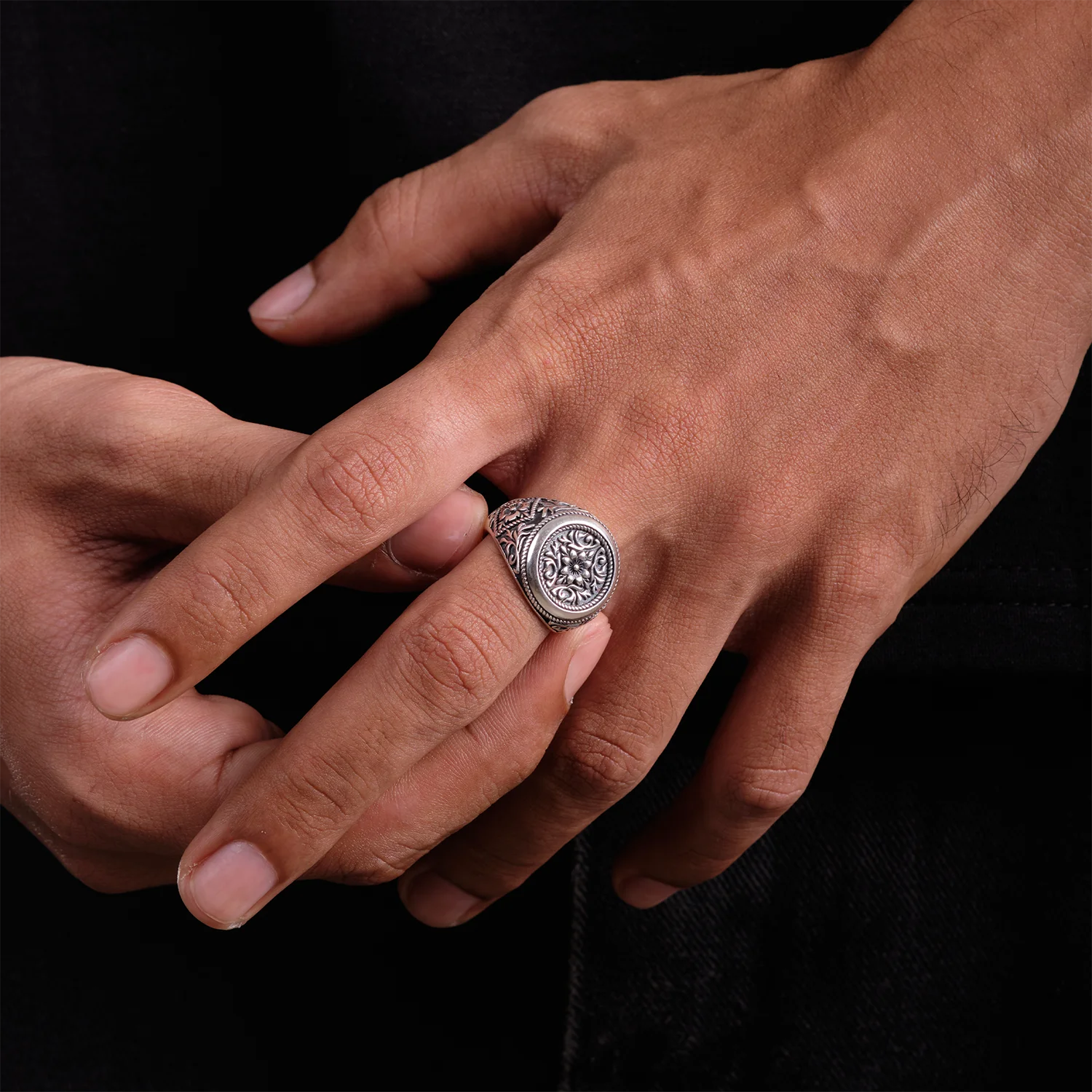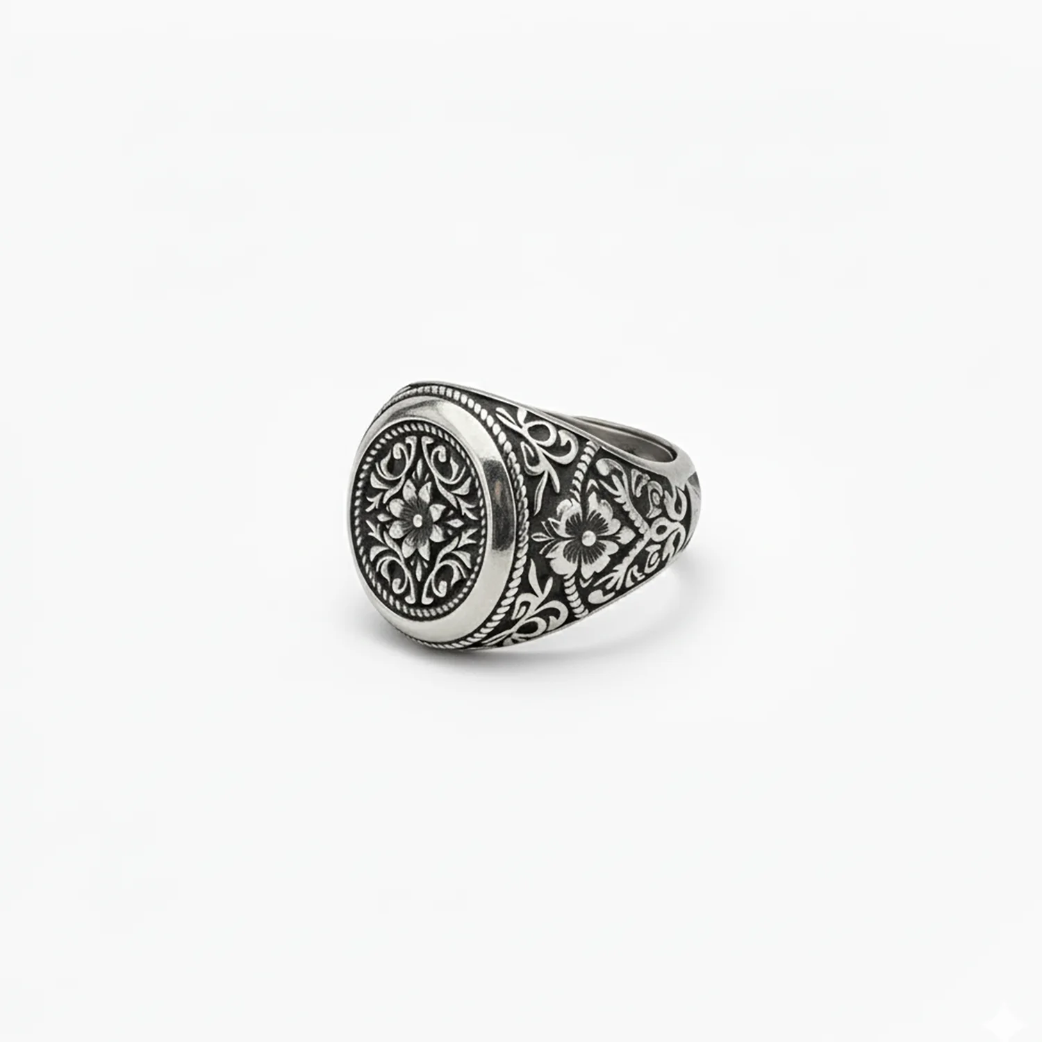The detail continues along the shank. Flourishing scrollwork and flower motifs run down each shoulder, their lines cut deep into the 925 sterling silver men’s signet ring. Darkened backgrounds and polished highlights create a play of light and shadow that rewards a second glance, yet the band subtly narrows beneath the finger to keep the ring balanced and comfortable in daily wear.
