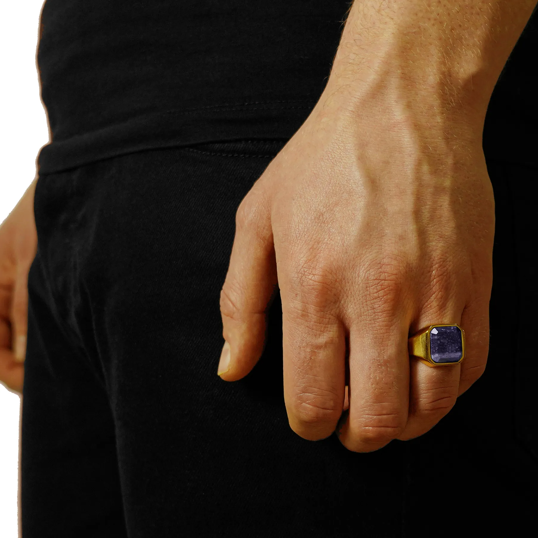 This Gold Lapis Lazuli Ring exudes timeless elegance, crafted from durable 316L stainless steel and plated in 18k gold. A celestial blue lapis lazuli stone, flecked with golden pyrite, is the focal point, evoking a starry night sky. Bold yet refined, this ring radiates wisdom and strength, making it a statement of power and sophistication.