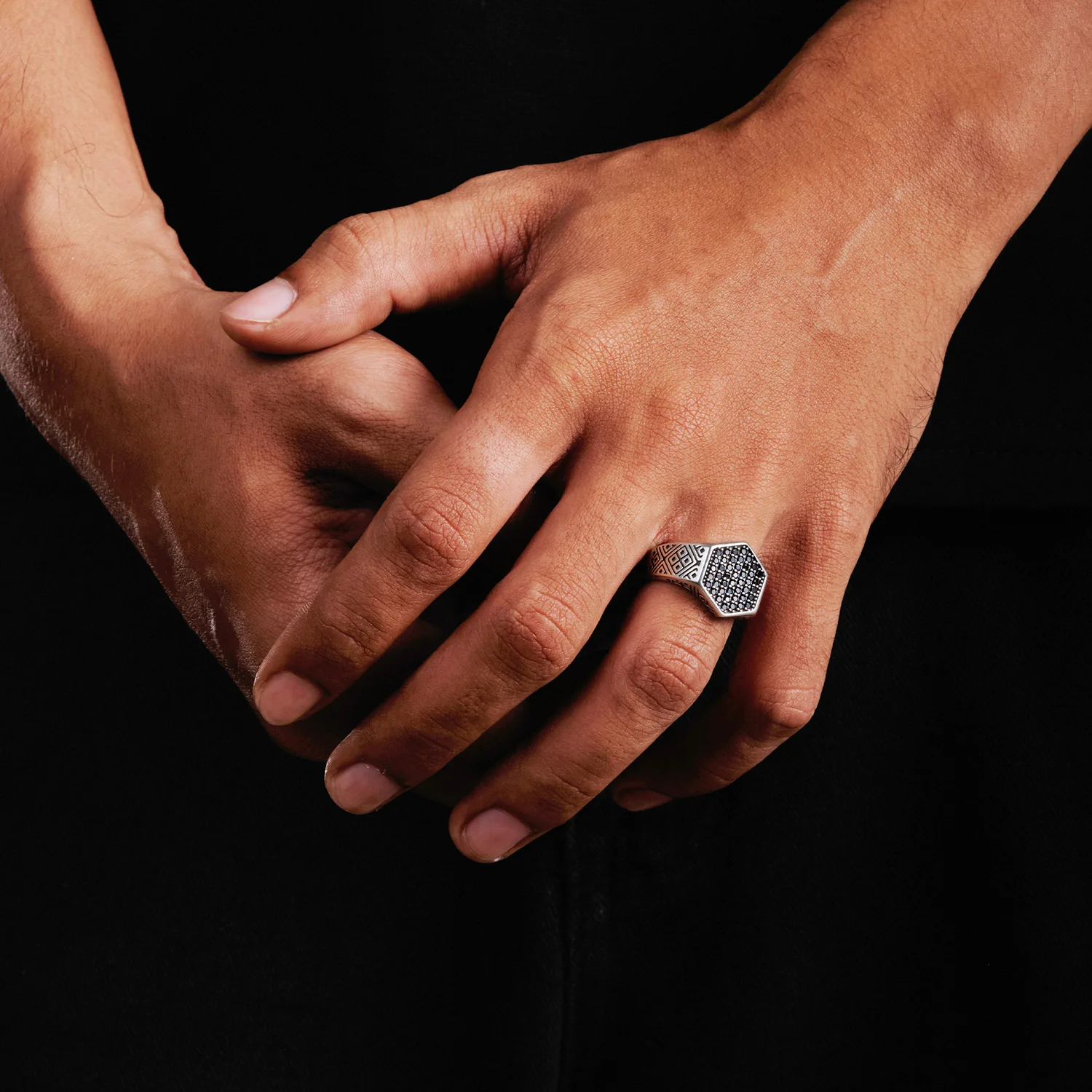 Design Inspiration: We looked to mosaic “tesserae” and the hexagonal logic of nature—honeycomb, basalt columns, engineered grids. Translating those rhythms into metal, we set a bead-studded lattice inside a sharp hexagon and etched the shoulders to echo the flow, creating a precise yet tactile 925 sterling silver signet with city-light sparkle and timeless order.