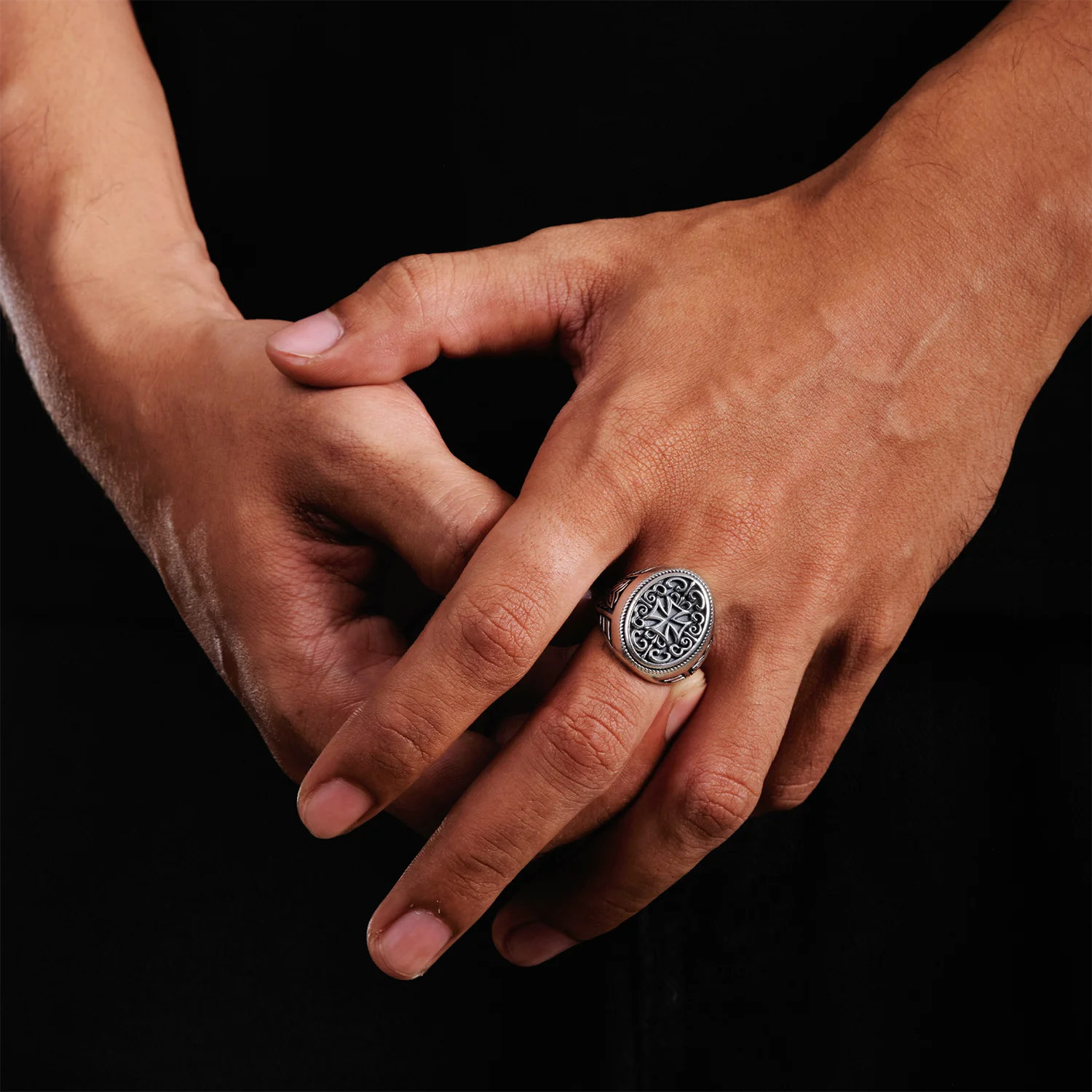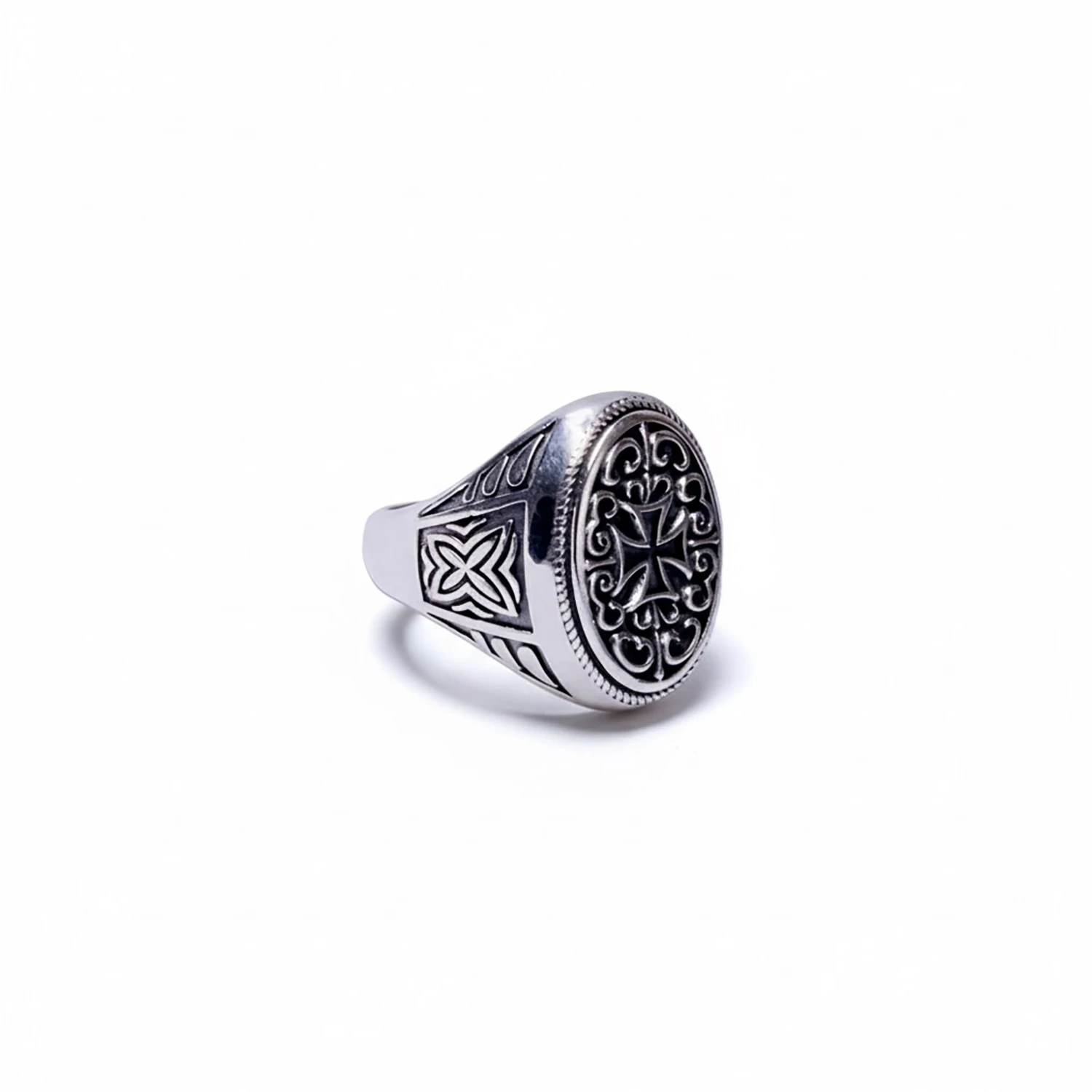 Cast in solid 925 sterling silver, the Maltese Cross ring blends clean heraldry with rich detail. At the centre, a sharply defined Maltese Cross sits within a recessed, oxidised ground so the emblem reads clearly at a glance. Surrounding scrollwork and a rope-cut border give the oval signet depth, while polished edges catch the light for refined contrast.