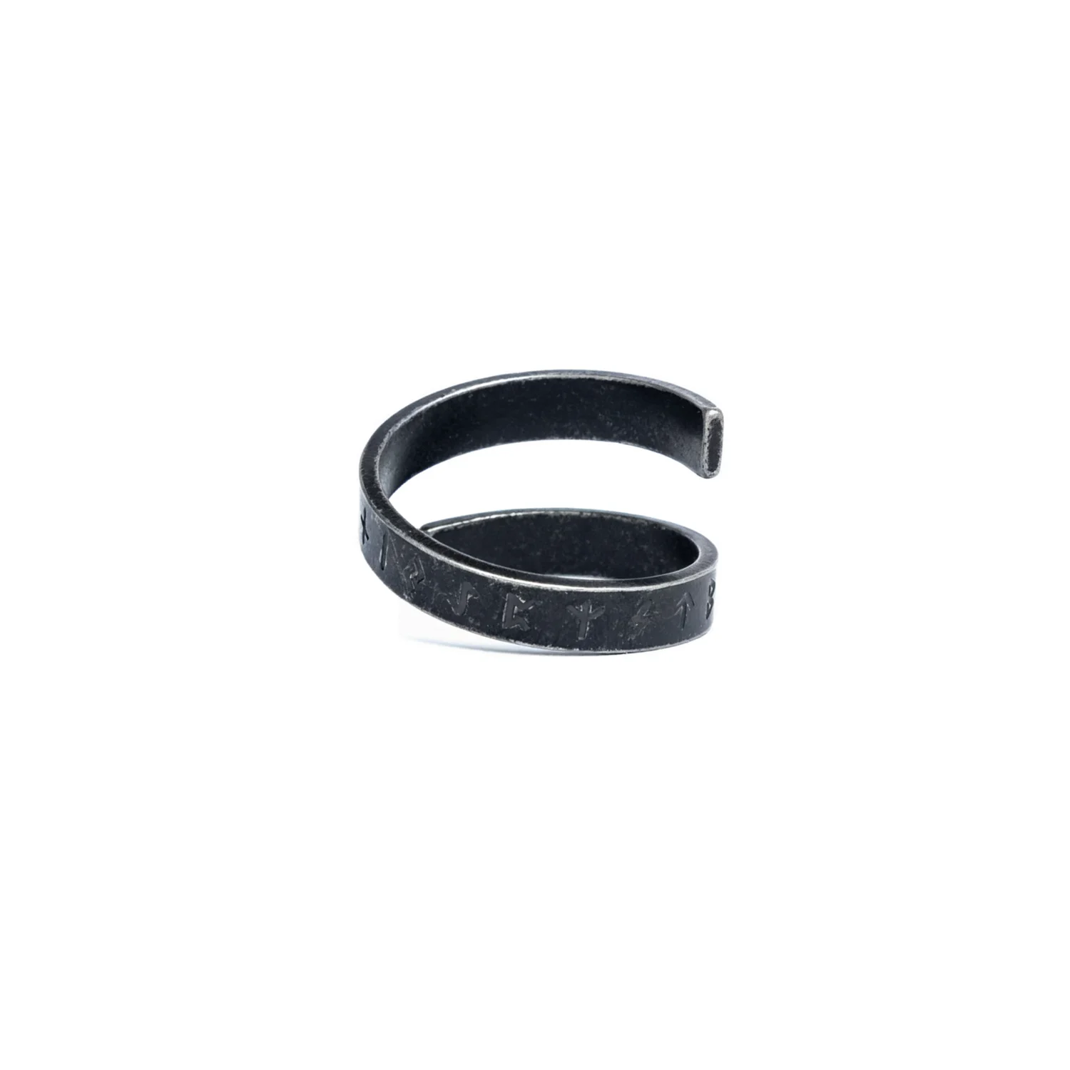 Forged in 316L stainless steel, the Nordic Cipher Coil wraps twice around the finger, laser-etched with Elder Futhark runes. A dark, stone-washed finish and bright-rubbed edges create crisp contrast. The open coil adjusts easily; the smooth interior keeps it comfortable, hypoallergenic and water-resistant. A modern men’s stainless steel Viking ring with quiet, purposeful presence.