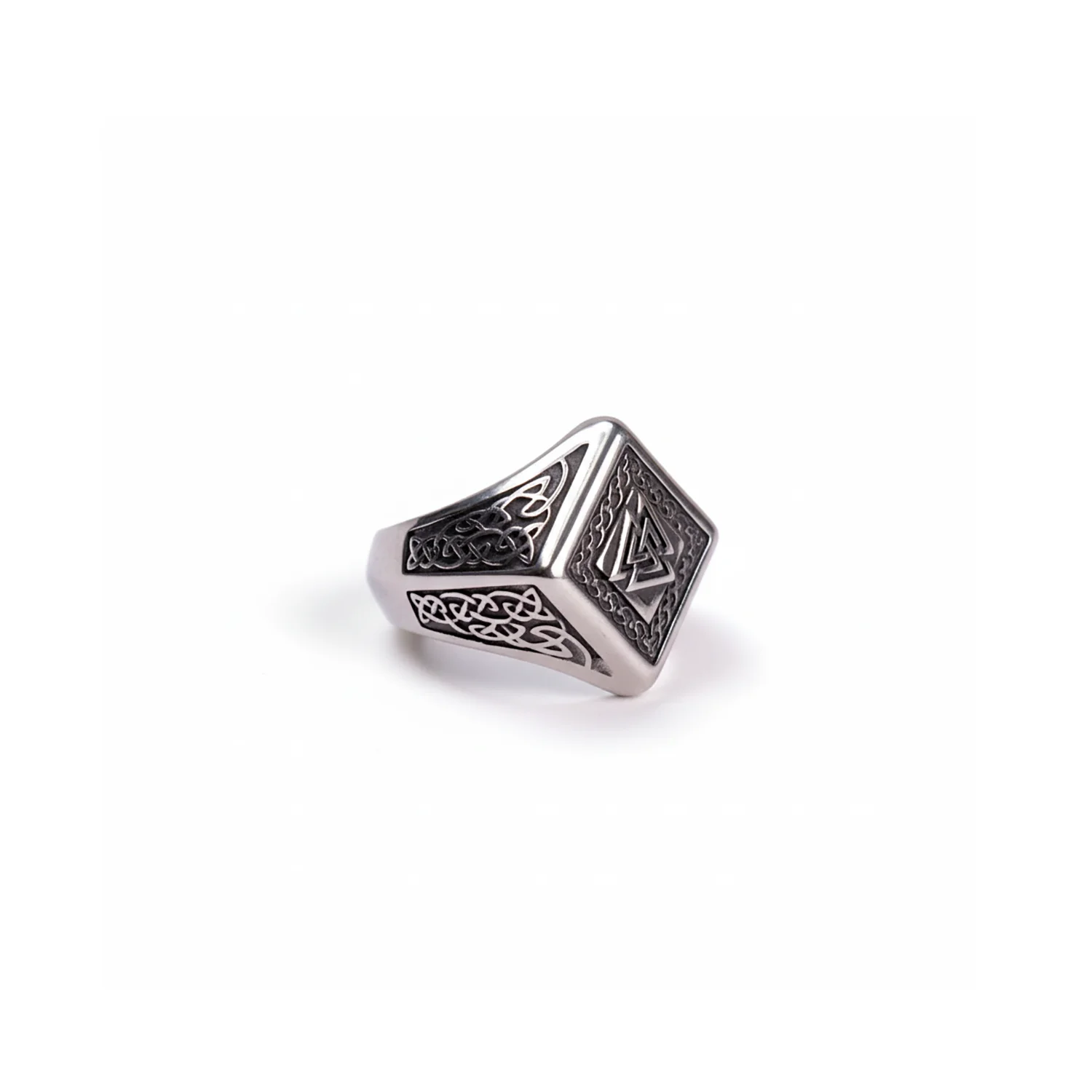Forged from premium-grade 316L stainless steel, our Norse Valknut ring sets the triple-triangle emblem inside a square signet framed by braided borders. Oxidised knotwork on the shoulders adds depth; bright-polished edges catch the light. The comfort-fit band is hypoallergenic, water and sweat resistant, and built for daily wear—a modern men’s Viking ring with clean architecture and lasting grit.