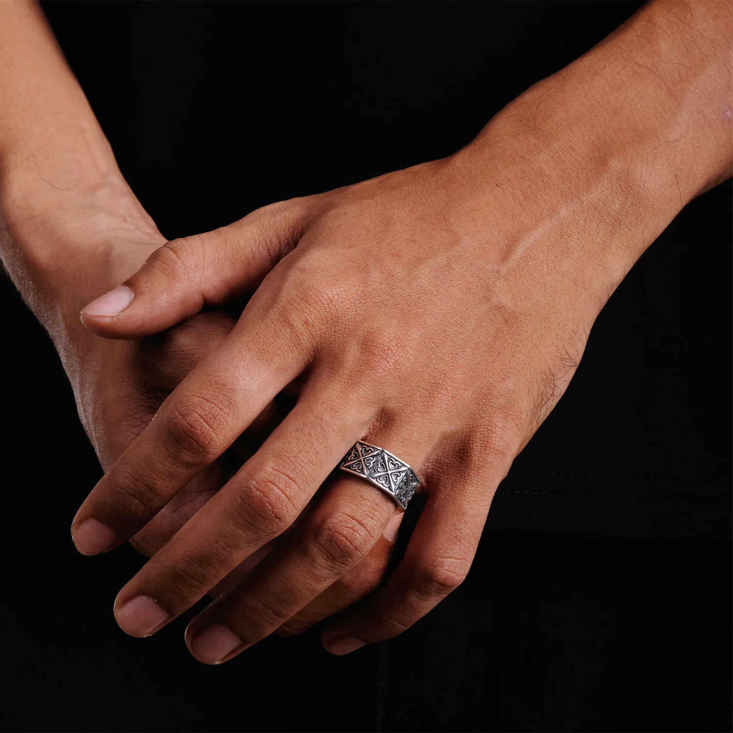 Sculpted in solid 925 sterling silver, the Quatrefoil Heart Prism Ring blends a crisp geometric band with a repeating heart–quatrefoil pattern. Deep, oxidised relief sharpens the artwork and gives this men’s sterling silver ring strong contrast that catches light across its prism-cut edges.