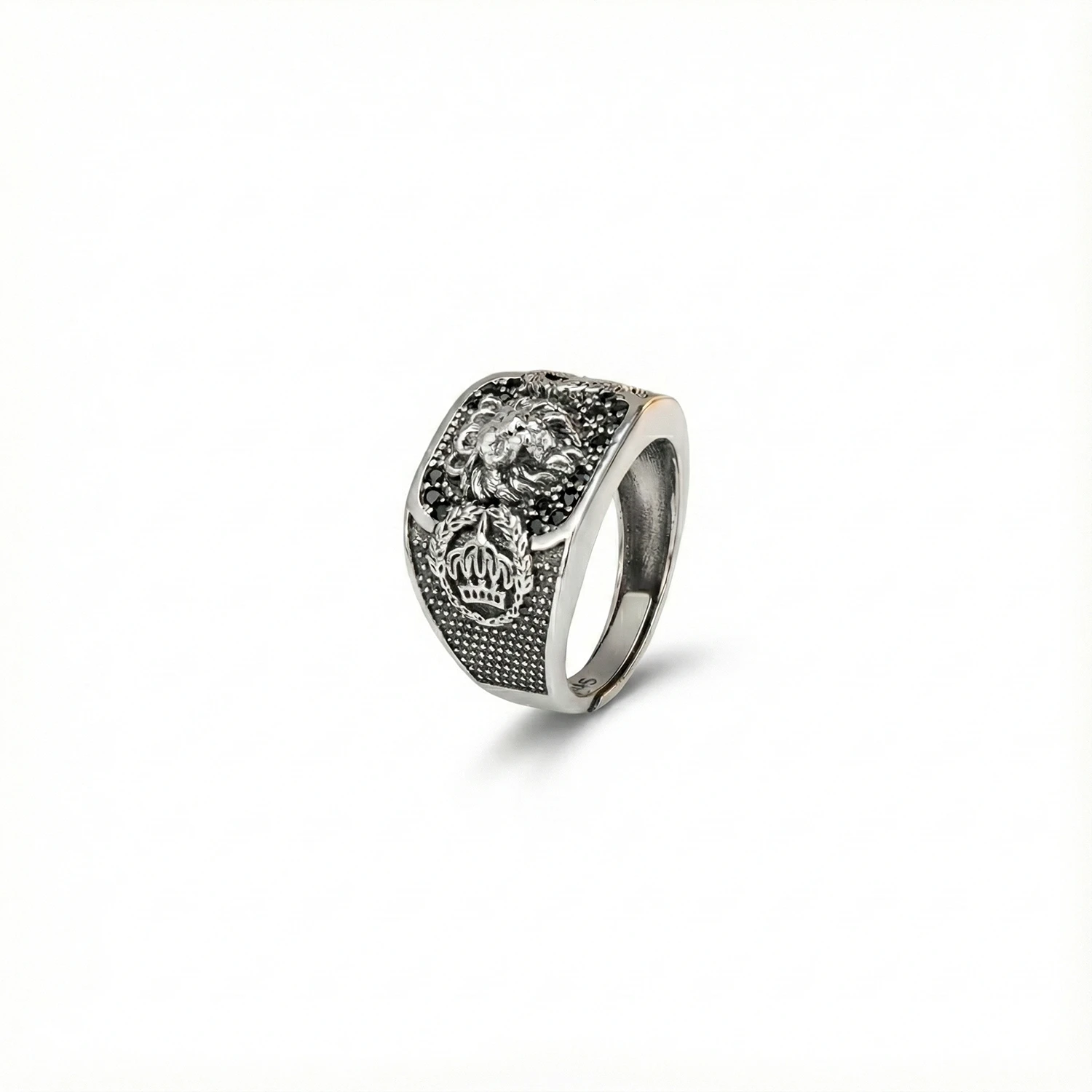 There is a certain gravity to a lion motif when it is handled with care. The Regal Lion Signet Ring centres a meticulously rendered lion’s head, each strand of mane lifted in high relief against a dark, stippled ground. The face is framed by a halo of black crystals that adds depth and catches the light, so the 925 sterling silver lion ring appears almost medallion-like on the hand.