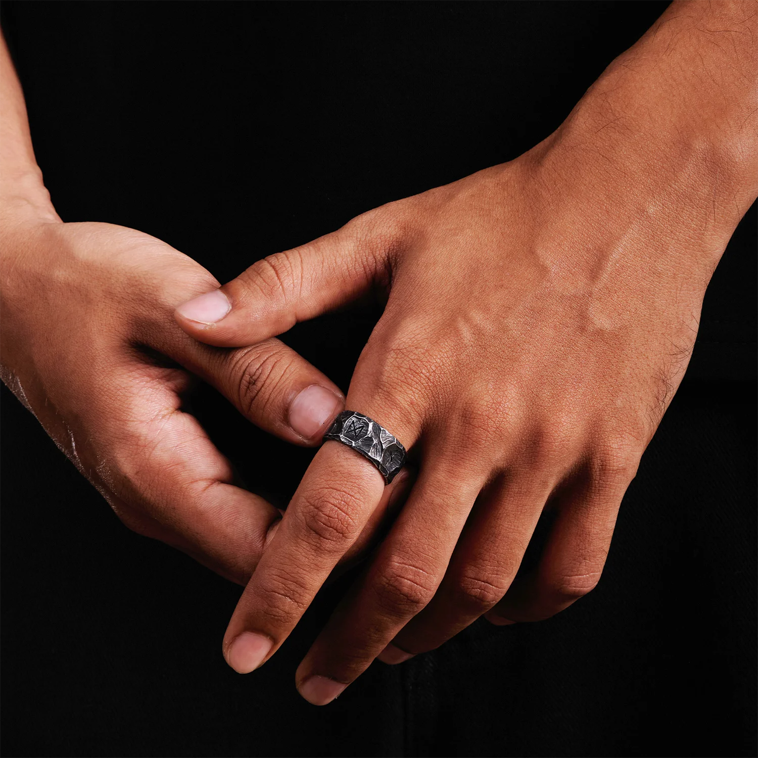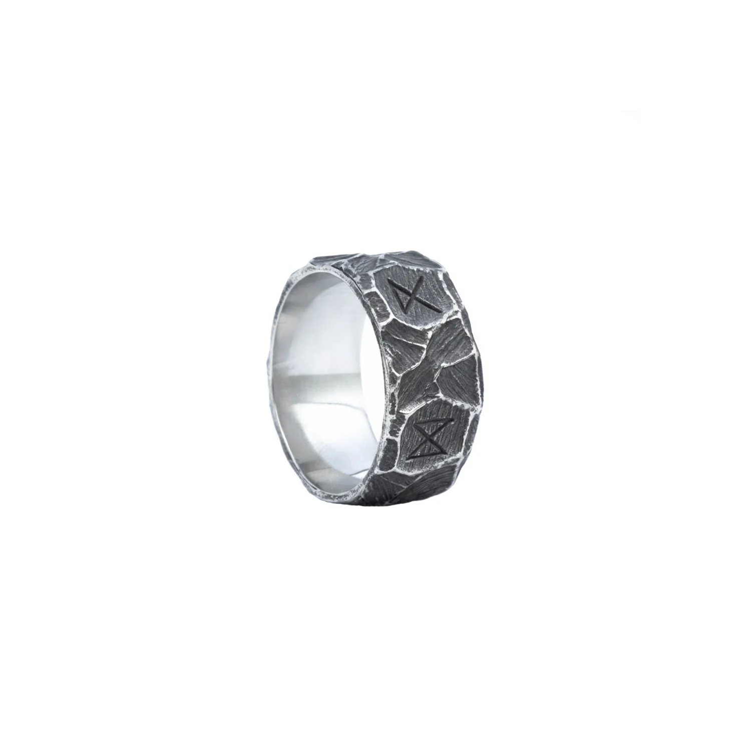 Built to outlast daily wear, the Runic Stonework ring is cast in premium 316L—hard-wearing, colour-true and corrosion resistant. We sculpted the exterior into fractured “stone” planes, then blackened the valleys to deepen the relief. Between the facets, a sequence of Norse runes is engraved in crisp lines so each character reads cleanly against the darkened ground.