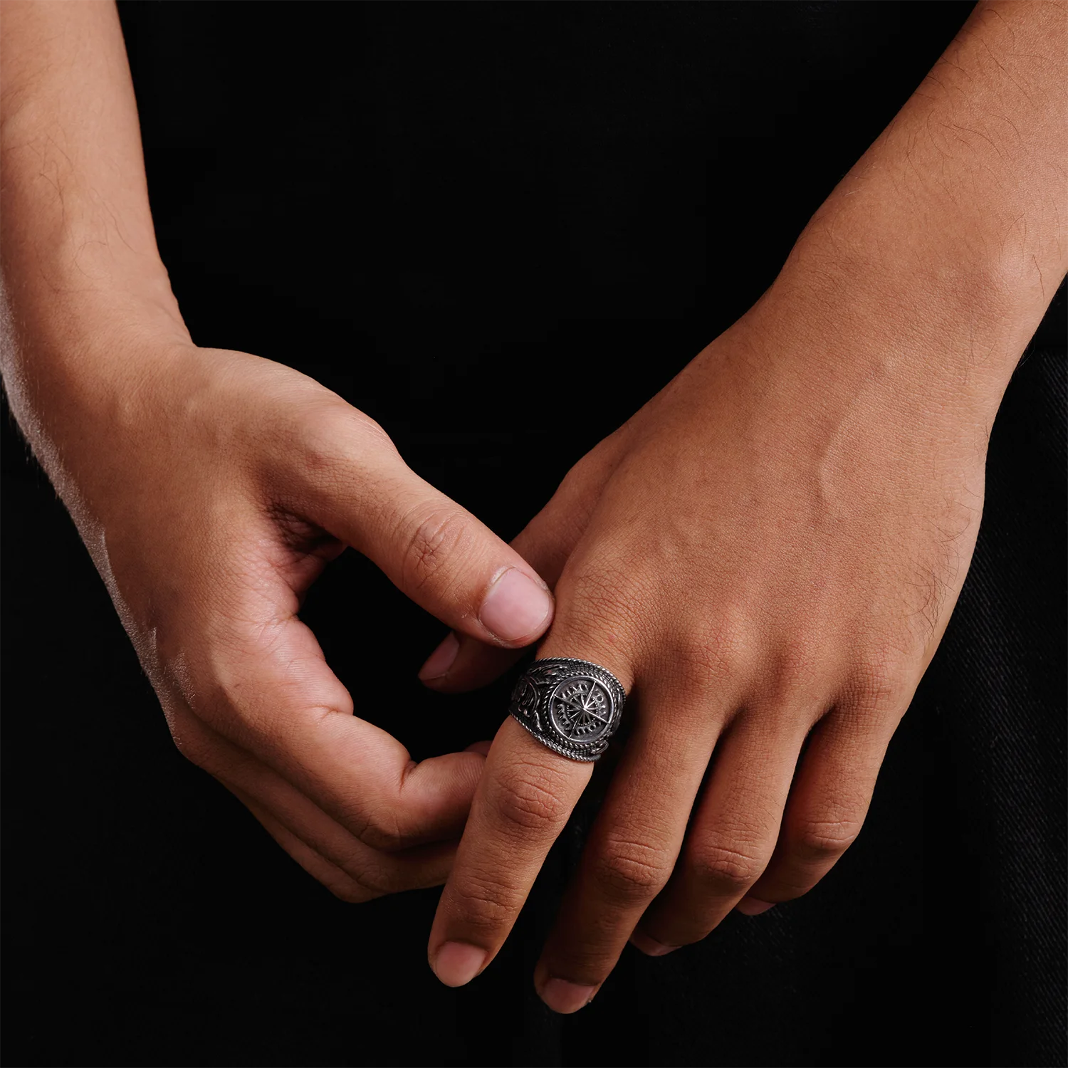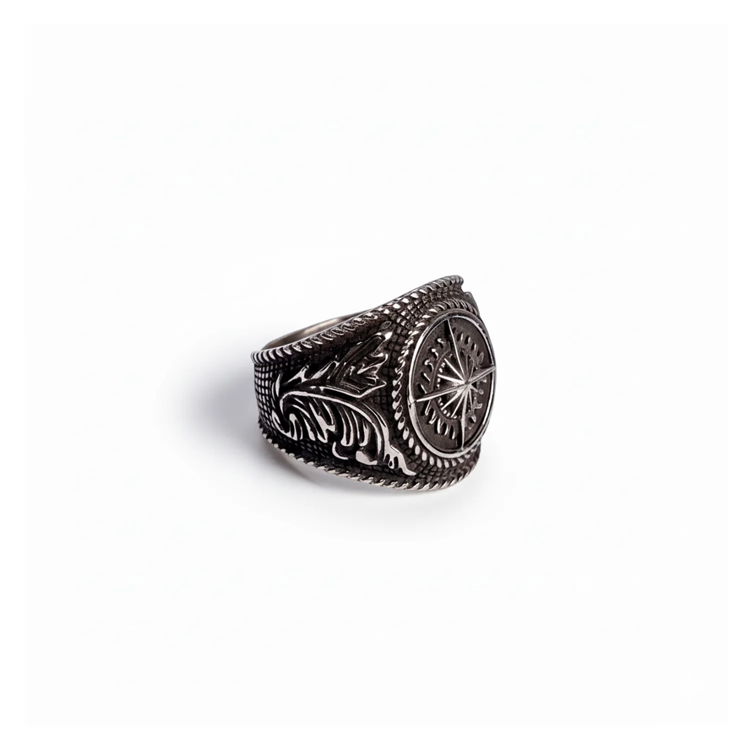 Design inspiration: We studied brass deck compasses and weathered ship wheels—the confident geometry, the knurled rims, the rope-set bezels. Translating those cues into steel, we sculpted a raised compass-rose, oxidised the dial for map-like depth, and wrapped it with braided borders. The result: a vintage-styled 316L stainless steel compass ring that feels ready for charting new routes.