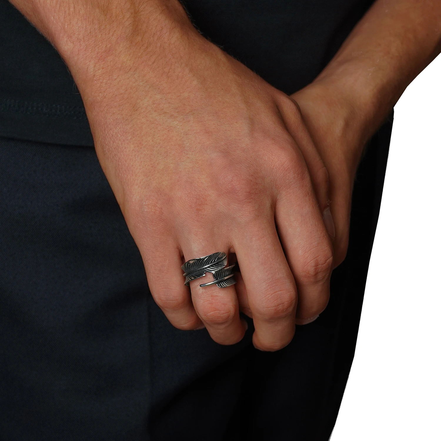 This men’s silver feather ring is a study in movement—two sculpted feathers sweeping around the band in a clean, wrapped form. The carved barbs and darkened recesses create a crisp contrast, giving the piece depth and definition without turning loud.