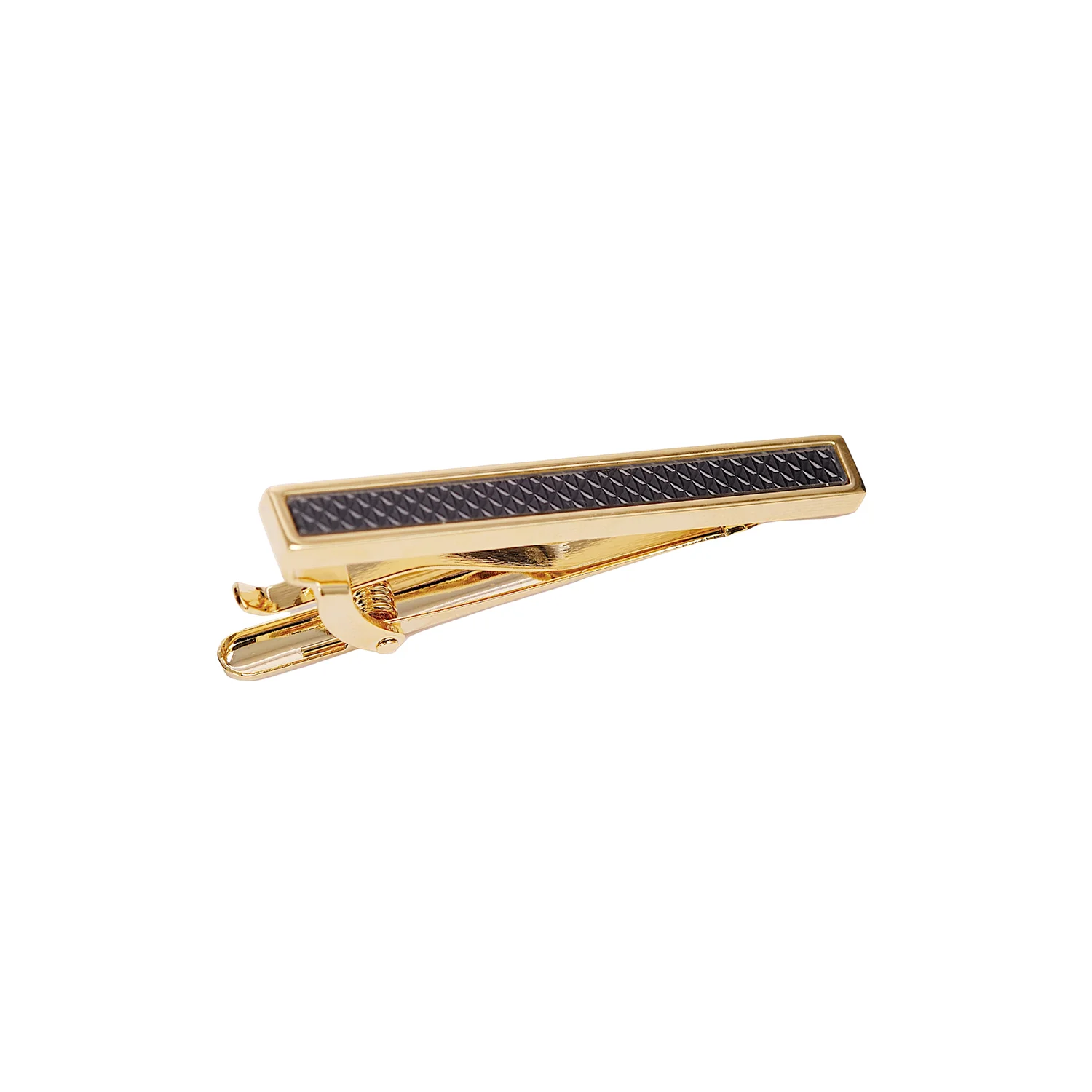 There is a quiet theatre to the Aureate Noir Tie Clip. A slim 18k gold-plated bar frames a jet-black guilloché panel whose fine, repeating geometry turns light into a soft ripple. The silhouette is disciplined – straight, narrow, impeccably balanced – thus the men’s gold tie clip reads as a line of intent rather than ornament.