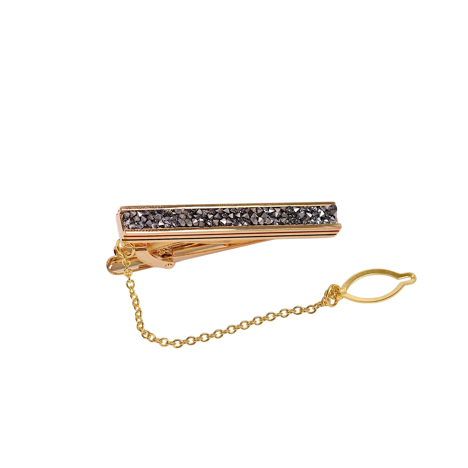 Design inspiration: “Shardline” recalls the crisp edge of quarried stone and the disciplined geometry of Art Deco. We set a narrow channel with faceted metallic fragments, then framed it in a warm gold surround and anchored the piece with a traditional safety chain. The result: a modern tie clip rendered in classic terms—order, glint and enduring grace.