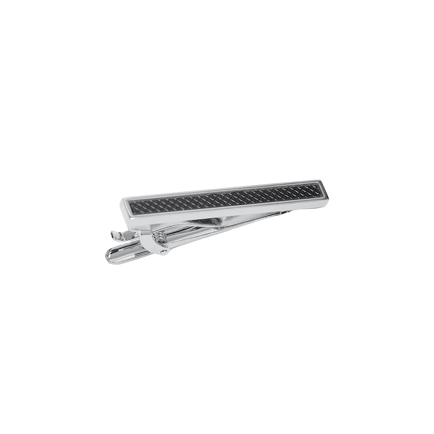 The Palladium Noir is a slender silver tie clip forged from marine-grade 316L stainless steel. A dark guilloché inlay runs the length of the bar, its pattern quietly catching the light. The tensioned clasp holds silk or wool without marking the weave. Hypoallergenic, water-resistant, and colour-true—an understated men’s stainless steel tie clip for the traditional wardrobe.