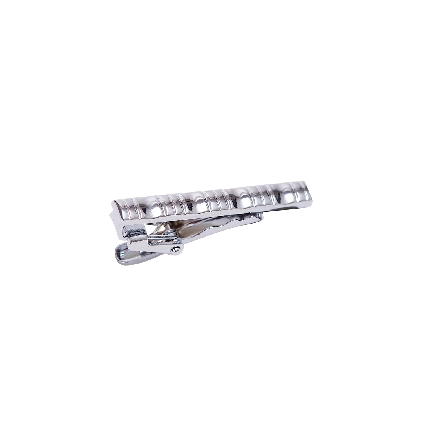 The Regent Flute is a slender silver tie clip forged from marine-grade 316L stainless steel. A rhythmic fluted pattern runs the length of the bar, catching the light with quiet clarity. The tensioned clasp holds silk or wool without marking the weave. Hypoallergenic, water-resistant and colour-true, this men’s silver tie bar completes business, wedding and black-tie attire.